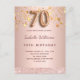 A modern, stylish and glamourous invitation for a 70th birthday party. A faux rose gold metallic looking background with faux gold dripping stars. The name is written with a modern dark rose gold coloured hand lettered style script. Personalise and add your party details. Number 70 is written with a balloon style font, script.