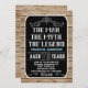 A bold 70th birthday invitation featuring white and blue text over a black background surrounded by wood. Please note the words, "The Man, The Myth, The Legend" and all ornamental lines are NOT editable.