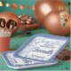 This over-the-hill design has a blue and white random number pattern with milestone number 70 repeated in varied sizes and angles. There is a white rounded square in the centre for your text and blues and white around the rim.