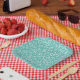 This cool design is a teal and white random number pattern with milestone number 70 repeated in varied sizes and angles in an all-over print.