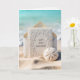 A beautifully embossed wedding invitation card rests inside an envelope on the sand near the ocean's edge, accompanied by a sand dollar for a 70th wedding anniversary.