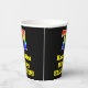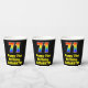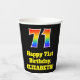 This exciting and fun birthday-themed paper cup design features a large number “71” with a rainbow spectrum gradient inspired pattern, along with the message “Happy 71st Birthday,”, and a personalised name. The background is coloured black. Colourful, vibrant paper cups like this might be fun to have at a birthday celebration being held to honour somebody’s seventy first birthday. [~Z0000537]