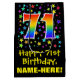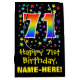 This colourful, vibrant, and exciting birthday-themed gift bag design features a large number "71" with a rainbow spectrum gradient style pattern, along with the message "Happy 71st Birthday,", and a personalised recipient name. It also has a background pattern featuring star shapes of various sizes and colours. A birthday themed gift bag like this might be a fun way to wrap a gift or present being given to somebody who is celebrating their seventy first birthday. [~Z0000510]