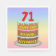 This upbeat and colourful birthday-themed paper napkin design features a cartoon-style depiction of a three-tier birthday cake having number-shaped candles on top showing the age “71“, along with the message “HAPPY 71ST BIRTHDAY,”, and a custom recipient name. The background features a multi-colour pastel rainbow spectrum inspired gradient pattern. Paper napkins like these might be used at a party held in celebration of somebody’s 71st birthday. [~Z0000623]
