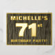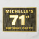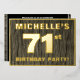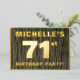 The front of this bold seventy-first birthday party/celebration foil invitation card features a customisable name, a large number “71st”, the message “BIRTHDAY PARTY!”, and a border, all in foil. There is a rustic, yet elegant, faux wood grain look inspired pattern for the background of the front. The back features personalised details about the event, such as the date, time, place/venue, and any other information that may be useful. Editable invitations like these might be used to invite attendees/guests to a birthday party being held to honour somebody’s 71st birthday. [~Z0000598]