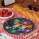 This fun, colourful, and cheerful paper plate design features a large number "71" having a rainbow spectrum gradient inspired pattern colouring. It also features a vibrant and exciting bursting celebratory fireworks inspired pattern. It has a black coloured background. Fun paper plates like this might be used at a celebration being held to observe somebody’s 71st birthday, a 71st anniversary, or some other seventy first event. [~Z0000490]