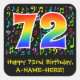 This fun, colourful, and vibrant birthday sticker design features a large number "72" having a rainbow spectrum gradient inspired pattern. It also features the message "Happy 72nd Birthday,", and a personalised name. Part of the background features a pattern of various music notes and symbols having a variety of colours and sizes. Fun, customisable birthday stickers like this might be used as a birthday party decoration, given as a birthday gift, or perhaps be used when wrapping birthday presents being given to celebrate a singer’s, a musician’s, a song composer’s, or somebody else’s seventy second birthday. [~Z0000423]