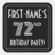 This elegant and 1920s-1930s style inspired seventy-second birthday party/celebration square sticker design features a personalised name, an intricate art deco look inspired number “72nd”, the message “BIRTHDAY PARTY!”, and a border pattern consisting of lines. It has a black-coloured background by default, but it can be customised to a different colour, if desired. Luxurious stickers like these might be used or distributed at a party held for somebody in celebration of their seventy second birthday, or perhaps used when wrapping presents/gifts or preparing invitations for such an event. [~Z0000617]
