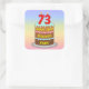 This fun and upbeat birthday themed square sticker design features a cartoon-style depiction of a three-tier birthday cake having numeral-shaped candles on top showing the number “73“, along with the message “HAPPY 73RD BIRTHDAY,”, and an editable recipient name. The background features a multicolored pastel rainbow spectrum inspired gradient pattern. Birthday themed stickers like these might be used or distributed at a birthday party celebrating somebody’s 73rd birthday, or perhaps used when wrapping gifts/presents or preparing invitations for such an event. [~Z0000624]