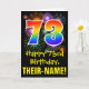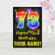 The front of this fun, exciting, and colourful birthday greeting card design features a large number "73" with a rainbow spectrum gradient inspired pattern, along with the message "Happy 73rd Birthday,", and a personalised recipient name. The front additionally features a colourful background pattern inspired by the appearance of bursting celebratory fireworks. The inside features a customised birthday greeting message, or could perhaps be cleared and left blank if a message is to be written by hand instead. A birthday card like this might be a fun way to send birthday wishes to somebody who is celebrating their seventy third birthday. [~Z0000442]