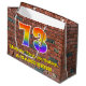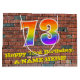 This vibrant and fun birthday-themed gift bag design, inspired by graffiti and street art, features a large number "73" with a rainbow spectrum gradient inspired pattern, along with the message "Happy 73rd Birthday,", and a customisable name. It also has a brick wall style pattern background. A colourful gift bag like this might be used when wrapping presents being given to somebody in celebration of their 73rd birthday. [~Z0000522]