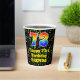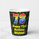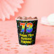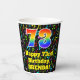 This cheerful and colourful music themed birthday paper cup design features a large number “73” with a rainbow spectrum gradient inspired pattern, along with the message “Happy 73rd Birthday,”, and a custom name. The background features a vibrant and colourful music notes and symbols pattern. Colourful, vibrant paper cups like this might be fun to use at a birthday party being held to honour somebody’s seventy third birthday. [~Z0000541]