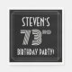 This Roaring Twenties inspired seventy-third birthday party paper napkin design features a customisable name, a fancy art deco look inspired number “73rd”, the message “BIRTHDAY PARTY!”, and a border pattern consisting of lines. It has a black-coloured background by default, but it can be customised to a different colour, if desired. Elegant birthday themed paper napkins like these might be used at a party celebrating somebody’s 73rd birthday. [~Z0000616]