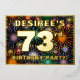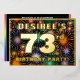 The front of this upbeat and fun seventy-third birthday celebration foil invitation card design features a personalised name, a large number “73rd”, the message “BIRTHDAY PARTY!”, and a border. The background of the front features an exciting, colourful bursting celebratory fireworks-inspired pattern. The back features personalised details about the event, such as the date, time, venue, and any other relevant information. Personalised invitations like these might be a fun way to invite attendees/guests to a birthday gathering/party being held to honour somebody’s 73rd birthday. [~Z0000602]