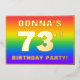 The front of this joyful seventy-third birthday party foil invitation card design features a personalised name, a large number “73rd”, the message “BIRTHDAY PARTY!”, and a border. The background of the front has an exciting, colourful, rainbow spectrum inspired gradient pattern. The back features personalised details about the event, such as the date, time, place, and any other information that may be useful. Personalised invitations like these might be a fun way to invite attendees/guests to a birthday party being held in celebration of somebody’s 73rd birthday. [~Z0000599]