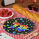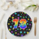 This fun, cheerful, and colourful paper plate design features a large number "73" containing a rainbow spectrum gradient inspired pattern colouring. The background features a colourful pattern of star shapes. Fun paper plates like this might be used at somebody’s 73rd birthday celebration, or a couple’s 73rd anniversary party, or some other seventy third event. [~Z0000493]
