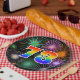 This cheerful, colourful, and fun paper plate design features a large number "73" containing a rainbow spectrum gradient inspired pattern colouring. It also features a vibrant and exciting bursting celebratory fireworks inspired pattern. The background is coloured black. Paper plates like this might be fun to use at a party being held to celebrate somebody’s 73rd birthday, an 73rd anniversary, or some other seventy-third event. [~Z0000490]