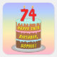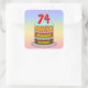 This joyful and upbeat birthday-themed square sticker design features a cartoon-style depiction of a three-tier birthday cake having numeral-shaped candles on top showing the number “74“, along with the message “HAPPY 74TH BIRTHDAY,”, and a custom recipient name. The background has a multicolored pastel rainbow spectrum inspired gradient pattern. Stickers like these might be used or given out at a birthday party held in celebration of somebody’s 74th birthday, or perhaps used when wrapping gifts/presents or preparing invitations for such an event. [~Z0000624]