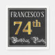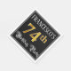 This elegant and ornate birthday themed paper napkin design features an editable name and the message “74th Birthday Party”. The large number “74th” has a faux/imitation gold-inspired colouring pattern, the words “Birthday Party” are in opulent script-style text, and the background is coloured black by default (although it can be customised). Luxurious, opulent paper napkins like this might be useful to have at a birthday celebration being held to honour somebody’s seventy fourth birthday. [~Z0000565]
