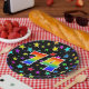 This fun, cheerful, and colourful paper plate design features a large number "74" coloured with a rainbow spectrum gradient inspired pattern. The background features a multicolored pattern of star shapes. Fun paper plates like this might be used at a celebration being held in honour of somebody’s seventy fourth birthday, or a couple’s seventy fourth anniversary, or some other 74th event. [~Z0000493]
