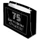 This 1920s/1930s style inspired vintage look birthday gift bag design features a large art deco appearance inspired number "75", the message "Happy 75th Birthday,", a personalised name, and a border pattern consisting of thin lines. The background is coloured black. A gift bag like this might be used when wrapping gifts being given to somebody in celebration of their seventy fifth birthday. [~Z0000497]