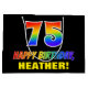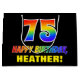 This fun, cheerful, and colourful birthday-themed gift bag design features a large number "75" and the message "HAPPY BIRTHDAY,", both having a rainbow spectrum gradient inspired pattern colouring, along with a bold yellow editable recipient name. The background is coloured black. A fun gift bag like this might be used when wrapping gifts being given to somebody in celebration of their seventy fifth birthday. [~Z0000477]
