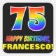 This fun, colourful, and cheerful birthday themed sticker design features a large number "75" and the message "HAPPY BIRTHDAY,", both having a rainbow spectrum gradient inspired pattern colouring, along with a bold yellow custom name. The background is coloured black. Fun stickers like this may be used when wrapping a birthday present or gift being given to somebody who is celebrating their seventy fifth birthday, or perhaps may be given out to the attendees at a birthday party. [~Z0000480]