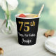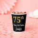 This sophisticated, stylish, and elegant birthday themed paper cup design features a large ordinal number “75th” having an imitation/faux gold-like look, along with the birthday greeting message “Happy 75th Birthday,” and a personalised name in a script-style font. The background is coloured black. Elegant birthday themed paper cups like this might be used at a party celebrating somebody’s 75th birthday. [~Z0000538]