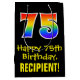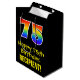 This exciting, fun, and colourful birthday-themed giftbag design features a large number "75" with a rainbow spectrum gradient style pattern, along with the message "Happy 75th Birthday,", and a personalised recipient name. The background is coloured black. A birthday themed gift-bag like this might be used when giving a gift or present in celebration of somebody’s seventy fifth birthday. [~Z0000512]