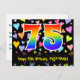 The front of this exciting, colourful, and fun birthday postcard design features a large number "75" having a rainbow spectrum gradient inspired pattern. It also features the message "Happy 75th Birthday,", and a personalised recipient name. The front additionally has a colourful and vibrant pattern of loving hearts. The back features a personalised birthday greeting message, or could perhaps be cleared and left blank if a message is to be written by hand instead. A personalised birthday postcard like this might be a fun way to send a message in celebration of somebody’s seventy fifth birthday. Postcards like this might also be used to invite guests to a birthday party or celebration being held for somebody who is turning 75 years old. [~Z0000448]