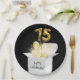 Gold balloons with sparkles and ribbons in a white box on black background for 75th birthday party.