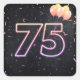 Glowing neon sign on black background with party balloons and confetti for 75th birthday party.