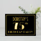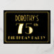 The front of this Roaring Twenties inspired and vintage-appearance seventy-fifth birthday celebration/party foil invitation features a personalised name, a large art deco look inspired number “75th”, the message “BIRTHDAY PARTY”, and a border pattern consisting of lines. The front also has a black-coloured background by default, but it can be customised to a different colour if desired. The back features personalised details about the event, such as the date, time, venue, and any other information that may be important. Luxurious, elegant, customisable invitations like these might be used to invite guests to a birthday party being held in celebration of somebody’s 75th birthday. [~Z0000591]