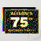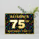 The front of this fun and joyful seventy-fifth birthday celebration/party foil invitation card design features an editable name, a large number “75th”, the message “BIRTHDAY PARTY!”, and a border. The background of the front has an exciting, multicolored pattern of stars. The back features personalised details about the event, such as the date, time, venue, and any other information that may be relevant. Customised invitations like these might be a fun way to invite attendees/guests to a birthday gathering being held to honour somebody’s 75th birthday. [~Z0000600]