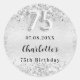 Faux silver looking background decorated with confetti. Personalise and add a date and a name. Black letters. 75 written with a balloon style font.
