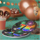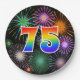 This cheerful, fun, and colourful paper plate design features a large number "75" containing a rainbow spectrum gradient inspired pattern colouring. It also features a vibrant and exciting bursting celebratory fireworks inspired pattern. The background is coloured black. Paper plates like this might be used when celebrating somebody’s 75th birthday, a 75th anniversary, or some other seventy fifth event. [~Z0000490]