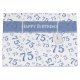 This design is a blue and white, random number pattern with milestone number 75 repeated in varied sizes and angles. There are a printed ribbon banner and a gift tag with text templates to change to your own words, name, initials, or monogram.