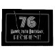 This vintage look Roaring Twenties style inspired birthday-themed gift bag design features a large art deco appearance inspired number "76", the message "Happy 76th Birthday,", a custom name, and a border pattern consisting of thin lines. It also features a black-coloured background. A gift bag like this might be used when wrapping presents being given to somebody in celebration of their 76th birthday. [~Z0000497]