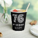 This vintage appearance and Roaring Twenties inspired birthday paper cup design features a large art deco inspired appearance number “76”, along with the birthday greeting message “Happy 76th Birthday,” and a personalised name. It also has a black-coloured background. Paper cups like this might be used at a party for somebody who is celebrating their seventy sixth birthday. [~Z0000542]