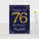 Happy Birthday with simulated golden glitter number 76 set on dark purple blue and framed by faux diamonds and rhinestones. Happy birthday and recipients name in off-white font. Personalize with name or message.
