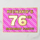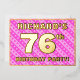 The front of this joyful seventy-sixth birthday party foil invitation card design features an editable name, a large number “76th”, the message “BIRTHDAY PARTY!”, and a border. The background of the front features an upbeat light pink and dark pink stripes pattern containing heart shapes. The back features personalised details about the event, such as the date, time, location, and any other important information. Customisable invitations like these might be a fun way to invite guests/attendees to a birthday party being held to honour somebody’s 76th birthday. [~Z0000603]