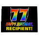 This cheerful, fun, and colourful birthday gift bag design features a large number "77" and the message "HAPPY BIRTHDAY,", both having a rainbow spectrum gradient inspired pattern colouring, along with a bold yellow personalised recipient name. The background is coloured black. A fun gift bag like this might be used when wrapping presents being given to somebody in celebration of their seventy seventh birthday. [~Z0000477]