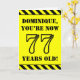 The front of this bold and attention-grabbing birthday-themed greeting card design features a custom name and the message "YOU’RE NOW 77 YEARS OLD!" in black stencil look text on a yellow coloured background. The front also features an eye-catching yellow and black striped pattern at the top and bottom edges. The inside features a personalised birthday greeting message, or could perhaps be cleared and left blank if a message is to be written by hand instead. A customisable birthday card like this might be a fun way to send birthday wishes to somebody who is celebrating their seventy seventh birthday. [~Z0000413]