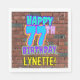 This fun birthday themed paper napkin design features the message “HAPPY 77TH BIRTHDAY,” having a colorful, vibrant, graffiti-inspired appearance, along with a custom recipient name. The background features a pattern inspired by the look of a brick wall. Birthday themed paper napkins like this might be used at a birthday party celebrating somebody’s seventy seventh birthday. [~Z0000534]