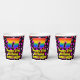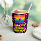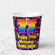 This cheerful and fun birthday paper cup design features a large number “77” having a rainbow spectrum gradient inspired pattern. It also features the message “Happy 77th Birthday,”, and a customisable name. The background features a pattern of heart shapes with colours like red, pink, and purple. Cheerful, fun paper cups like this might be fun to have at a birthday party being held in celebration of somebody’s 77th birthday. [~Z0000548]