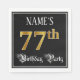 This fancy and elegant birthday themed paper napkin design features a personalized name and the message “77th Birthday Party”. The large number “77th” has a faux/imitation gold-inspired coloring pattern, the words “Birthday Party” are in luxurious script-style text, and the background is colored black by default (although it can be customized). Opulent, ornate paper napkins like this might be used at a birthday party/celebration being held to celebrate somebody’s seventy seventh birthday. [~Z0000565]