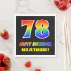 This cheerful, fun, and colourful birthday-themed paper napkin design features a large number "78" and the message "HAPPY BIRTHDAY,", both coloured with a rainbow spectrum gradient inspired pattern, along with a bold yellow customisable recipient name. The background is coloured black. Fun, customised paper napkins like this might be used at a birthday party being held to celebrate somebody’s seventy eighth birthday. [~Z0000476]