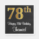 This sophisticated, luxurious, and elegant birthday-themed paper napkin design features a large ordinal number “78th” having an imitation/faux gold-like appearance, plus the birthday greeting message “Happy 78th Birthday,” and a customisable name in a script-style font. It also has a black-coloured background. Birthday themed paper napkins like this might be used at a birthday party celebrating somebody’s seventy eighth birthday. [~Z0000516]
