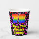 This joyful and cheerful birthday paper cup design features a large number “78” with a rainbow spectrum gradient inspired pattern, along with the message “Happy 78th Birthday,”, and a personalised name. The background features a pattern of heart shapes with colours like purple, red, and pink. Upbeat, fun paper cups like this might be fun to have at a birthday celebration being held to celebrate somebody’s 78th birthday. [~Z0000548]