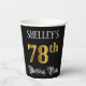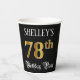 This elegant and luxurious birthday-themed paper cup design features a custom name and the message “78th Birthday Party”. The large number “78th” has a faux/imitation gold-inspired colouring pattern, the words “Birthday Party” are in ornate script-style text, and the background is coloured black by default (although it can be customised). Fancy, ornate paper cups like this might be useful at a birthday celebration being held to honour somebody’s 78th birthday. [~Z0000567]